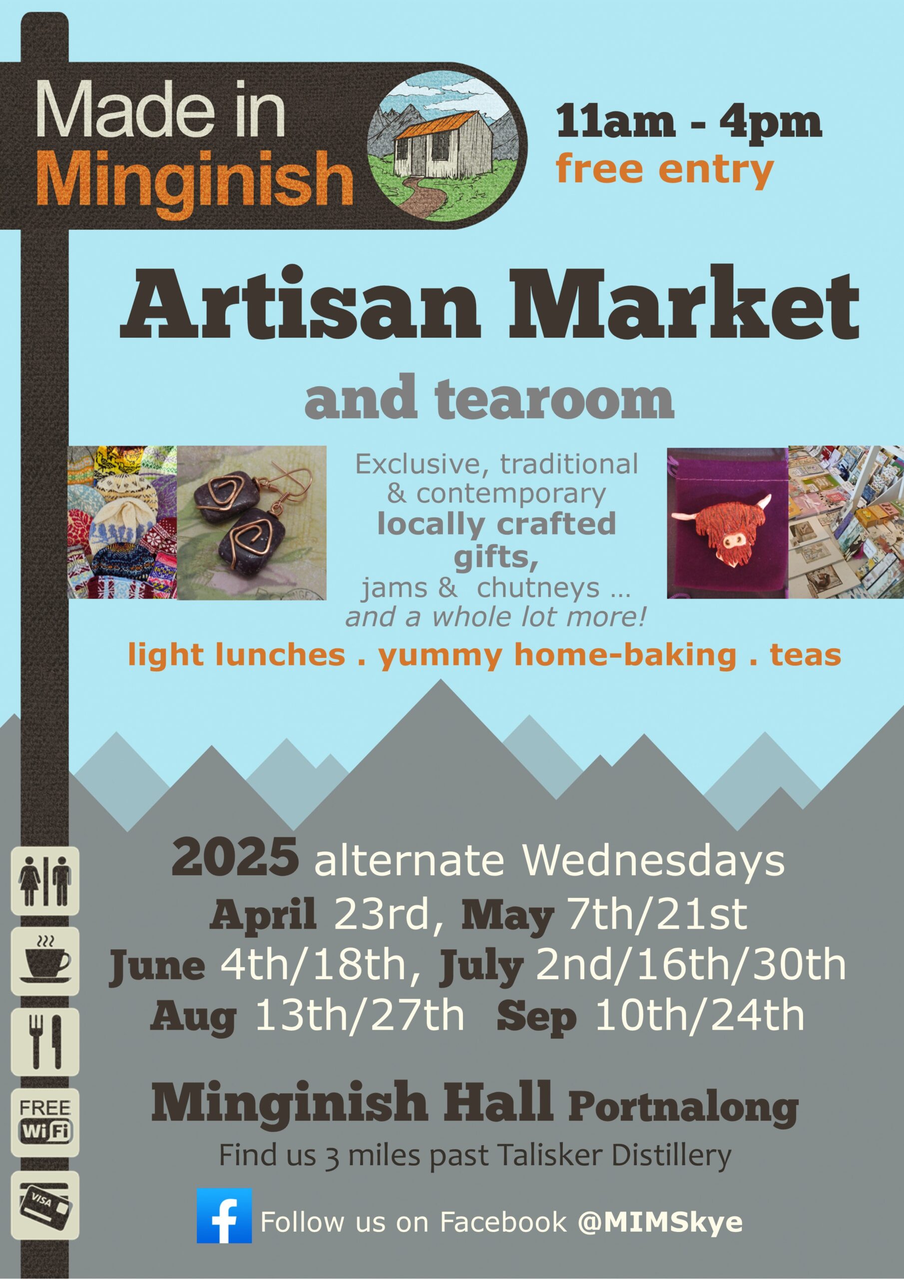 Join us on alternate Wednesdays from 23 April – 24th September 2025 for our friendly wee craft fair featuring locally made, quality hand-crafted items by artists and crafts people working in the Minginish area, guest makers from elsewhere in Skye, and stalls supporting local charities. Enjoy a cuppa with some scrummy home-baked cake or a scone—or stay for a warming bowl of homemade soup and a freshly filled roll in our warm, welcoming modern hall—you can even sit outside if the weather is kind! Free entry. Public toilets. Wi-Fi.